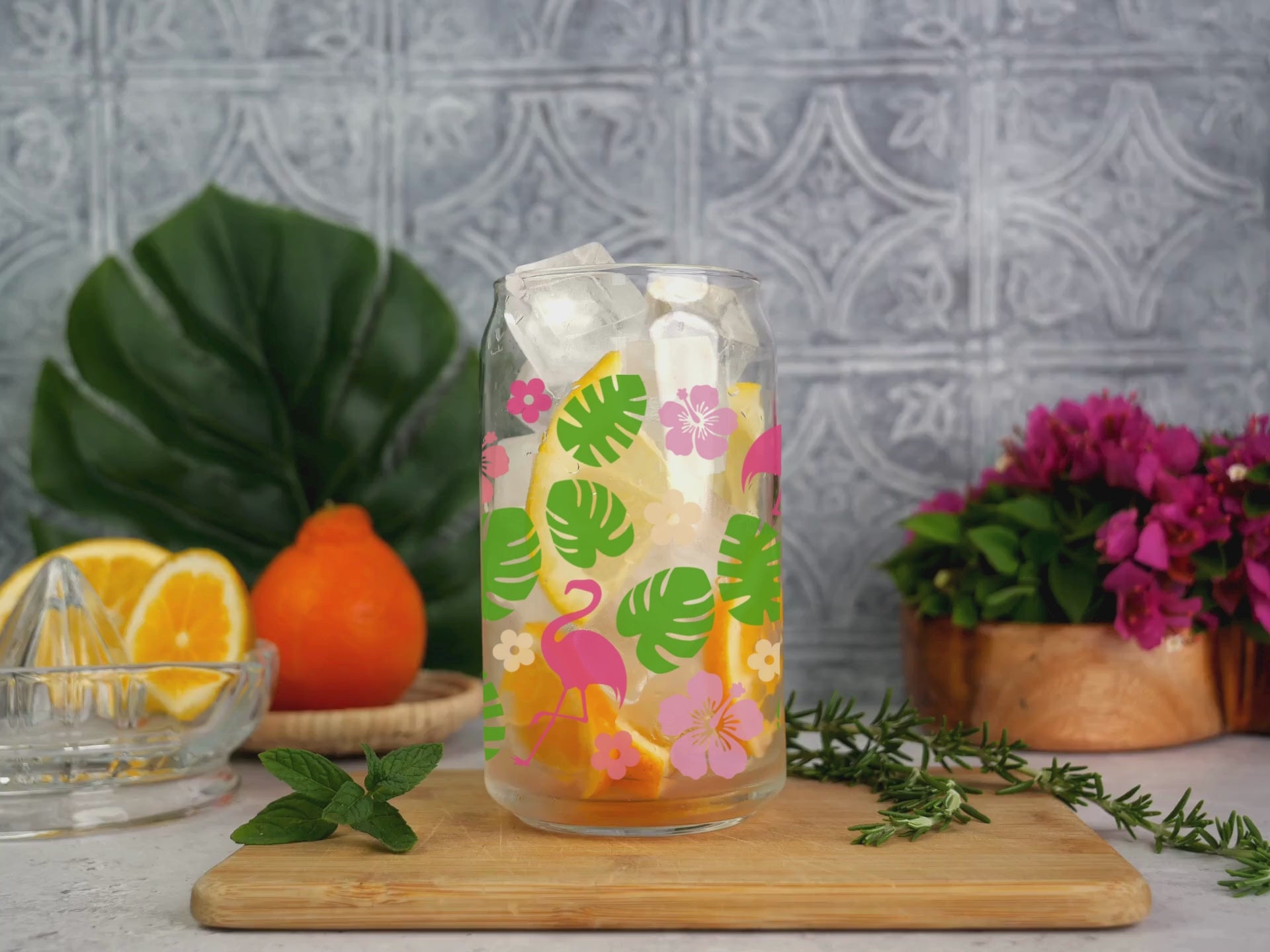 Elevate your drinkware collection with the Flamingos-Glass Cup. This stunning 16oz cup features a clear glass body, complemented by a bamboo lid and a glass straw, making it perfect for sipping your favourite beverages.