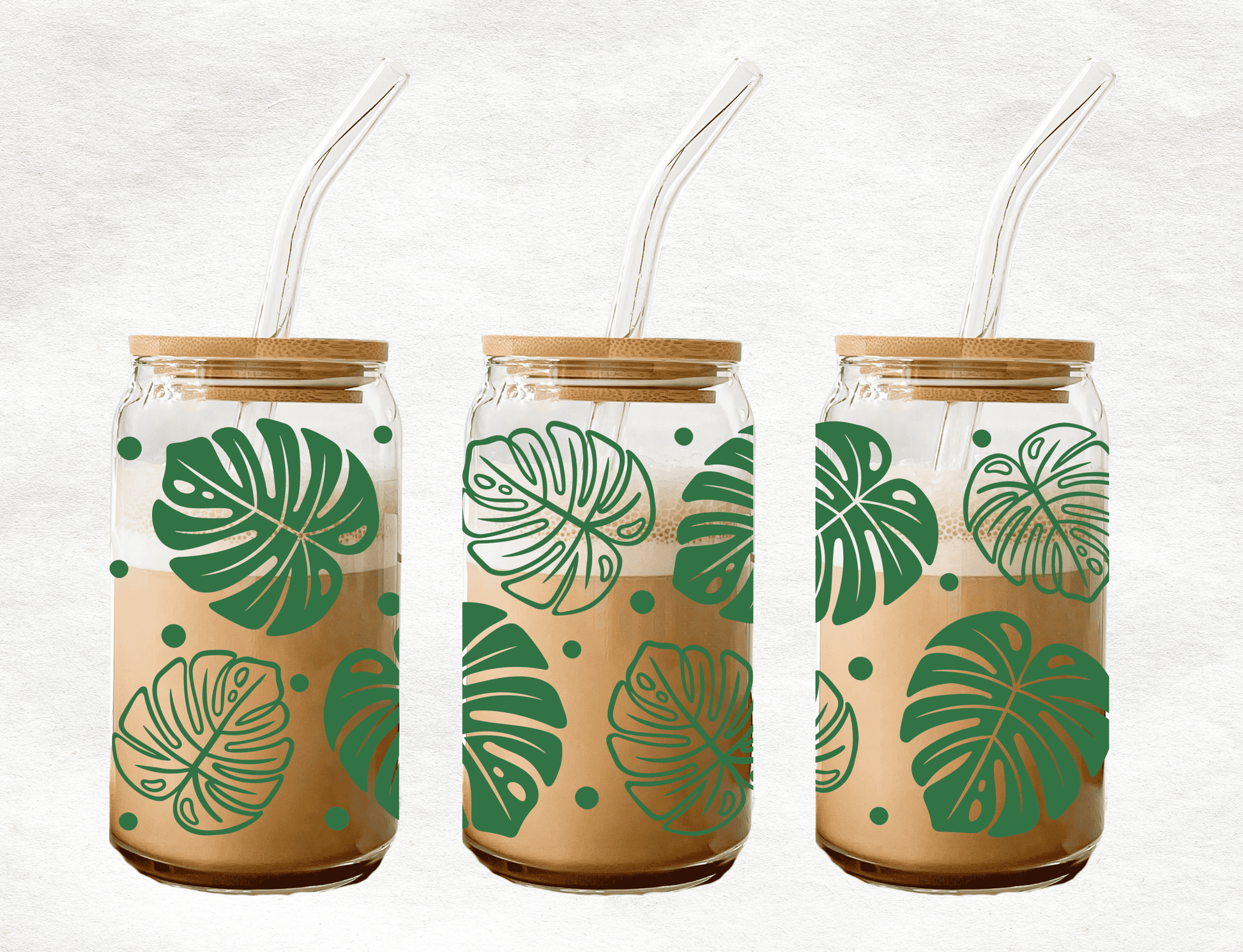 Introducing the Monster Leaf Glass Cup, a stylish and functional addition to your drinkware collection. This 16oz cup is crafted from clear glass and comes with a durable bamboo lid and a glass straw. Perfect for enjoying your favourite beverages, the design features permanent vinyl that adds a touch of elegance.